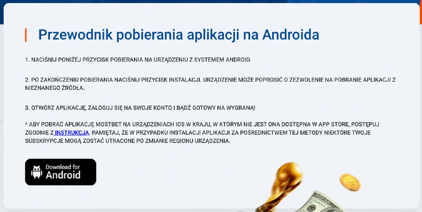 - Zarejestruj konto na Mostbet Android. Dokonuj wpłat i otrzymuj bonusy.